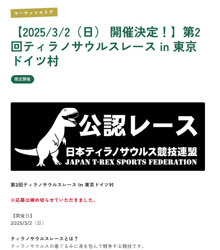 日本ティラノサウルス競技連盟が公認したレースが2025年3月2日(日)に千葉県袖ケ浦市にて開催されることが決定しました。