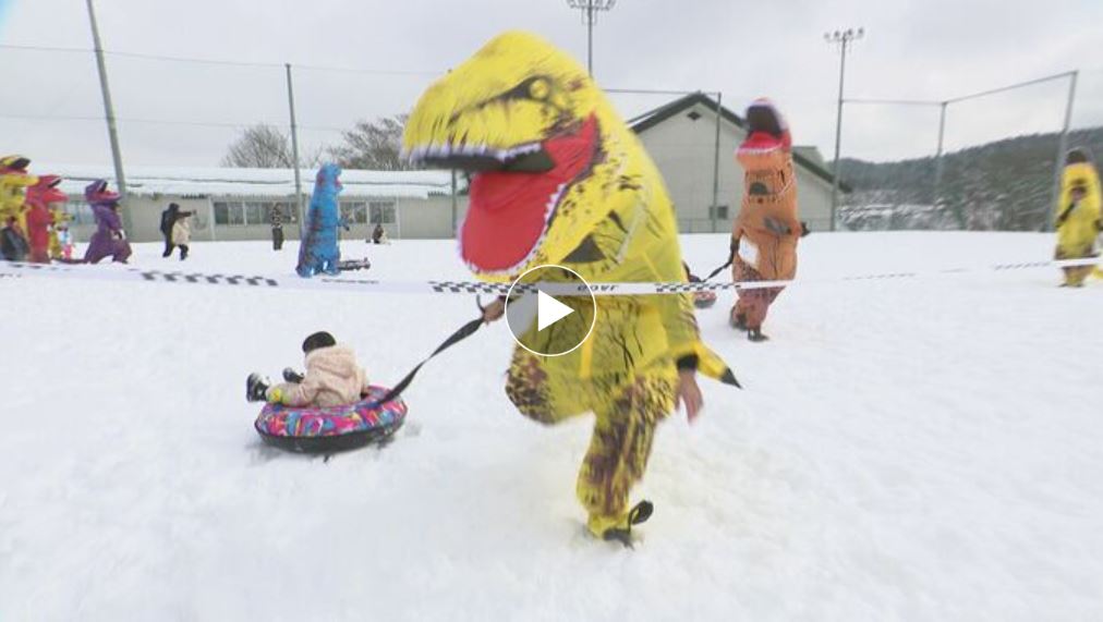 ティラノサウルスが大混戦!雪上を駆け抜ける…特産のリンゴを拾ってゴールへ 長野県飯綱町【SBC信越放送】