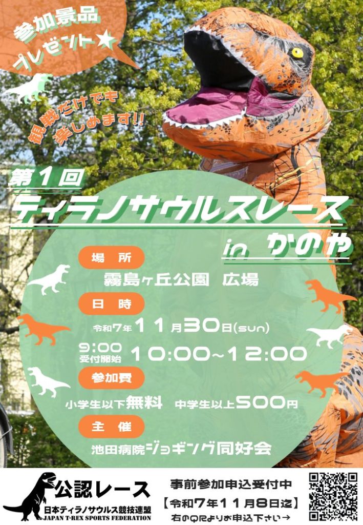 日本ティラノサウルス競技連盟が公認したレースが2025年11月30日(日)に鹿児島県鹿屋市にて開催されることが決定しました。
