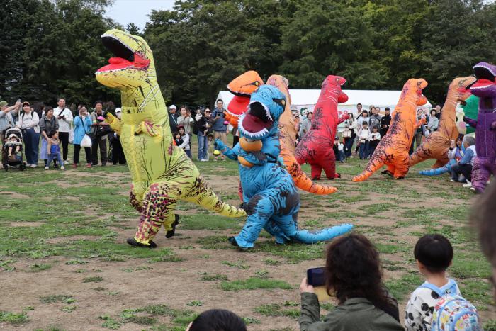 また、日本ティラノサウルス競技連盟の公認レースとして開催された「ティラノサウルスレース」では、参加者がティラノサウルスの衣装を身にまとい、おたまにボールを乗せたまま往復50メートルほどのコースを駆け抜けました。恐竜たちの力走に会場は大盛り上がりを見せ、ゴール後には悔しさのあまり泣きだす参加者も出るほど白熱したレースとなりました。
