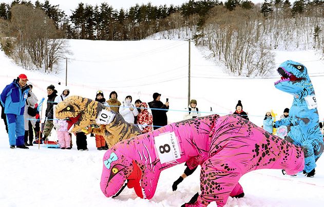 天童高原スノーパークフェスタが7日、天童市の同高原スキー場ゲレンデで2日間の日程で始まった。初日は恐竜の着ぐるみ姿で速さを競う「ティラノサウルスレース」などが行われ、親子連れなどが雪上に歓声を響かせた。 ティラノサウルスレースには小学生以下と中学生以上の2部門に各5人が参加した。