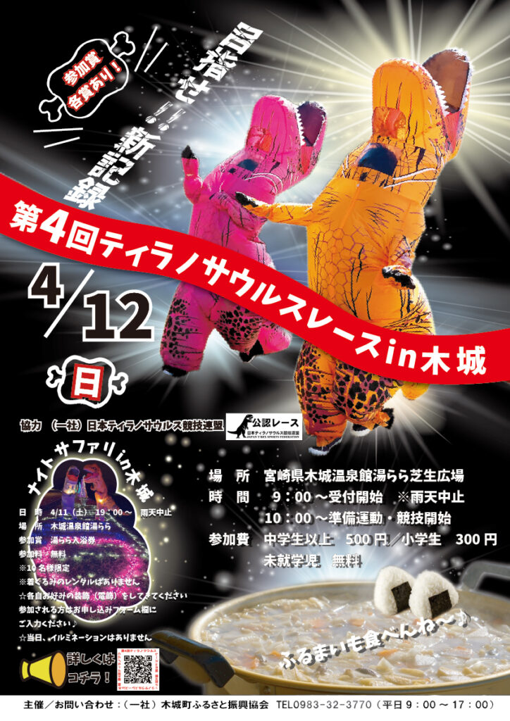 日本ティラノサウルス競技連盟の公認レースが2026年4月12日(日)に宮崎県児湯郡木城町にて開催されることが決定しました。
