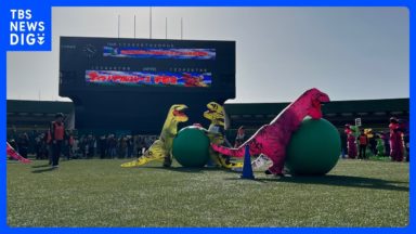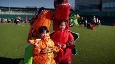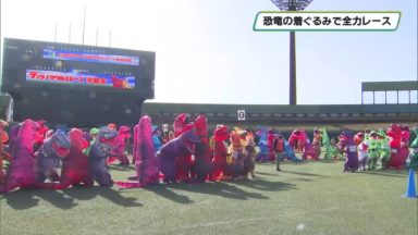 恐竜たちがLRTで清原球場へ 着ぐるみで駆け抜けるティラノサウルスレース 宇都宮市