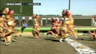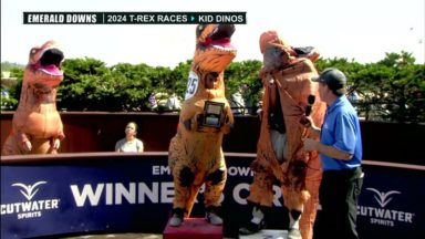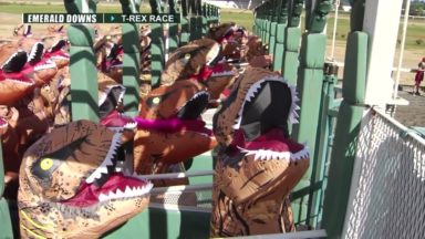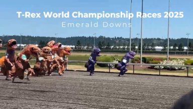 外国ティラノサウルスレース 36 views T-REX RACE: People wearing T-rex costumes raced at the Emerald Downs racetrack in Auburn 2019年7月10日