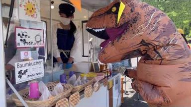 外国ティラノサウルスレース 36 views T-REX RACE: People wearing T-rex costumes raced at the Emerald Downs racetrack in Auburn 2019年7月10日